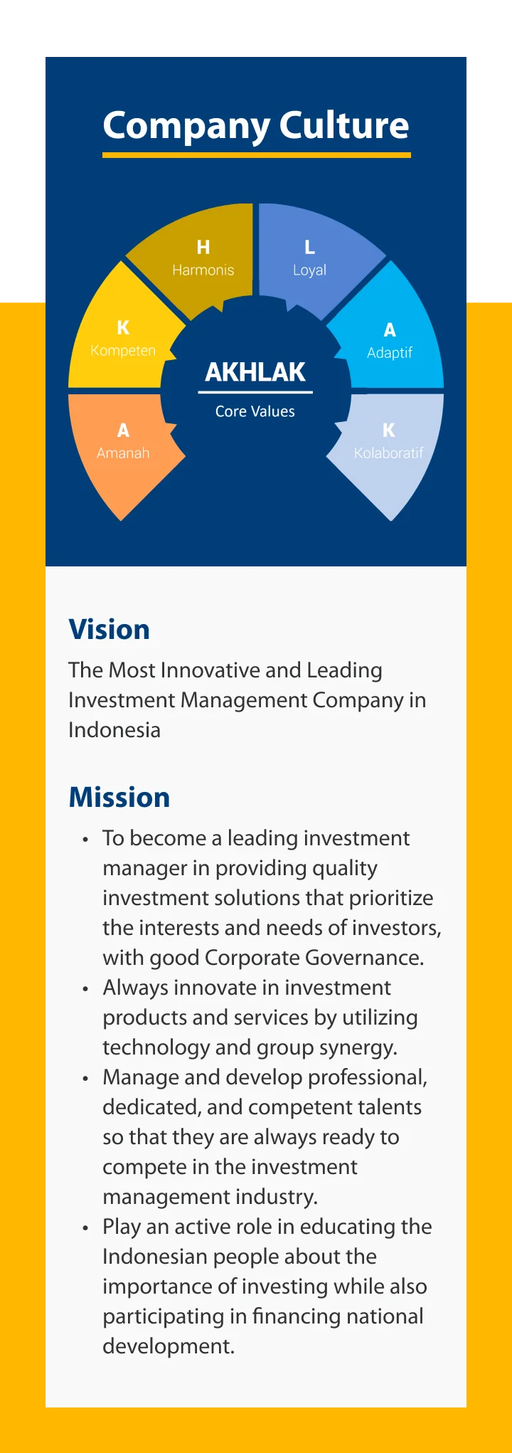 The fund management company, also known as Mandiri Investasi, which was established in October 26th, 2004 following a corporate spin-off from PT Mandiri Sekuritas. Currently the company is one of the largest fund manager in Indonesia with track record built since 1993.